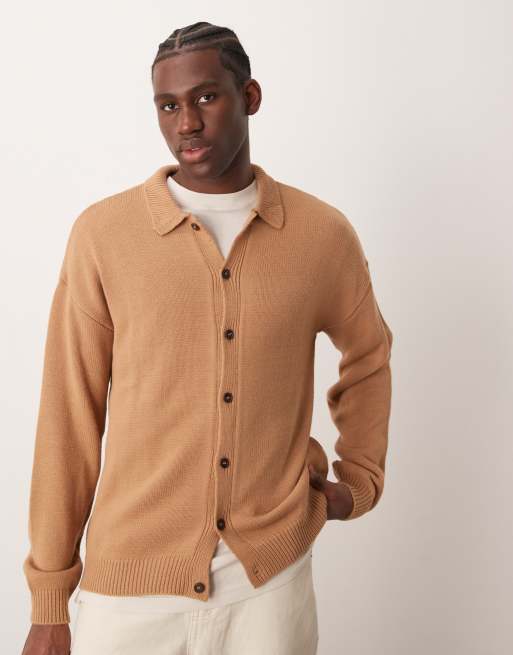 ASOS DESIGN relaxed boxy fit knitted cardigan with collar in stone