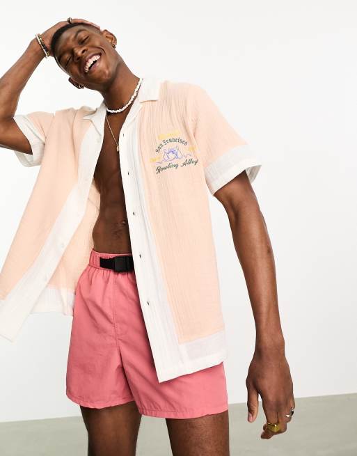 ASOS DESIGN relaxed camp collar cut and sew textured bowling shirt with chest embroidery