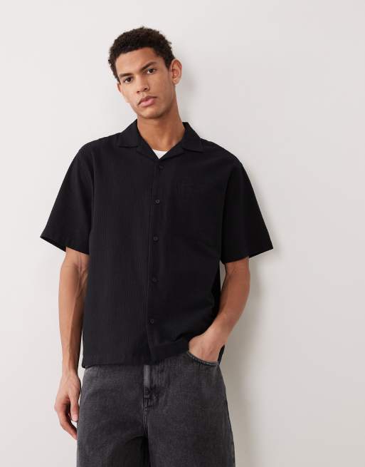 ASOS DESIGN relaxed camp collar seersucker shirt in black