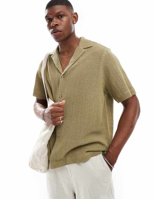 ASOS DESIGN relaxed deep revere basket weave shirt in khaki