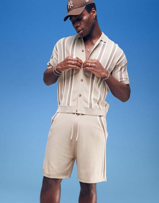 ASOS DESIGN relaxed fit knit button through polo shirt with textured stripe in beige - part of a set