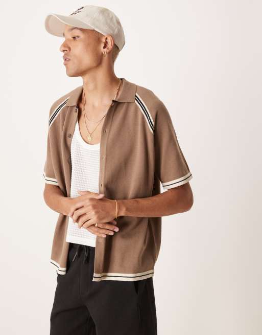 ASOS DESIGN relaxed knit button up polo in brown with contrast tipping