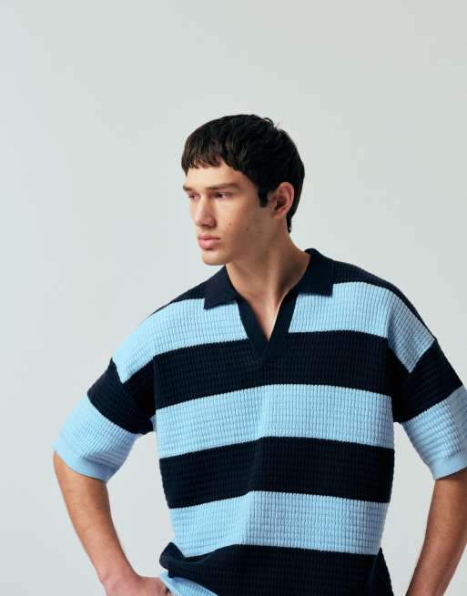 ASOS DESIGN relaxed knit notch neck polo in navy and blue stripe