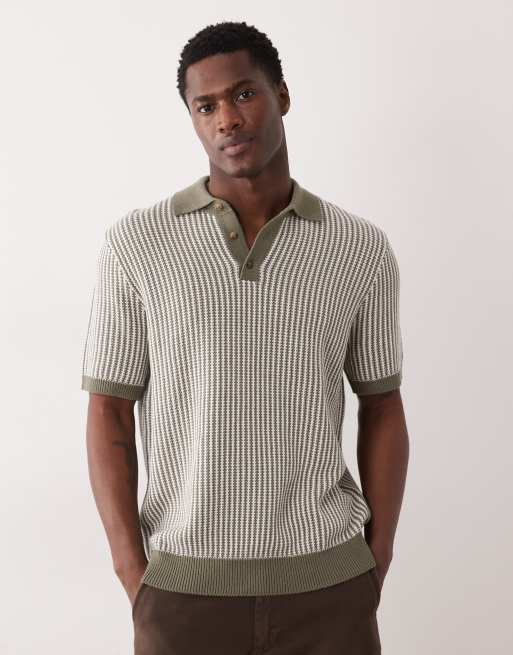 ASOS DESIGN relaxed knit striped polo shirt in green and ecru