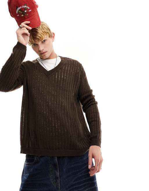 ASOS DESIGN relaxed knit sweater with ladder detail in brown