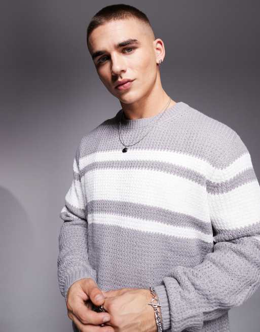 ASOS DESIGN relaxed knitted crew neck sweater in gray with white stripe