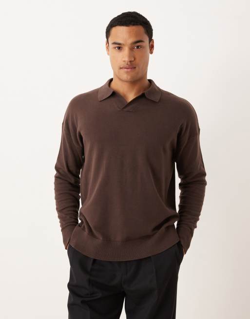 ASOS DESIGN relaxed long sleeve knit notch neck polo in brown