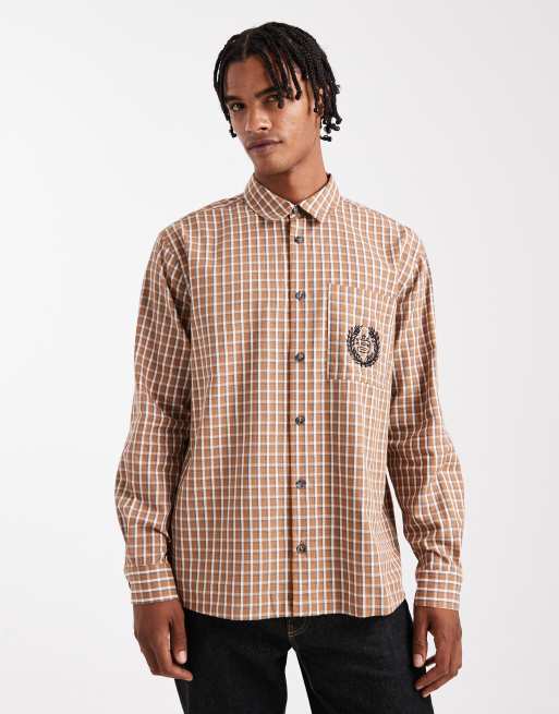 ASOS DESIGN relaxed plaid shirt with chest embroidery in brown