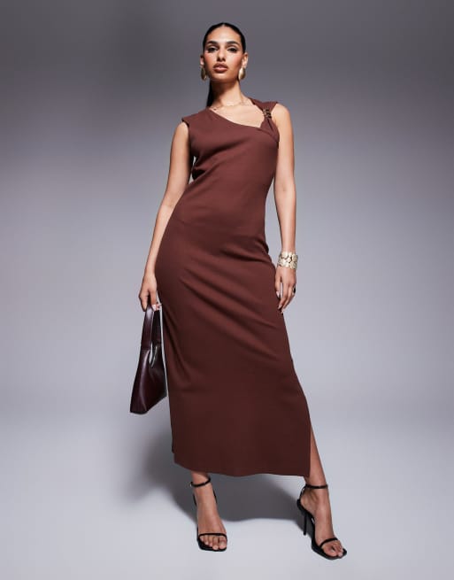 ASOS DESIGN ribbed knit midi dress with hardware detail in chocolate