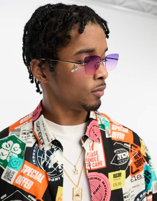 ASOS DESIGN rimless sunglasses in purple with rainbow charm