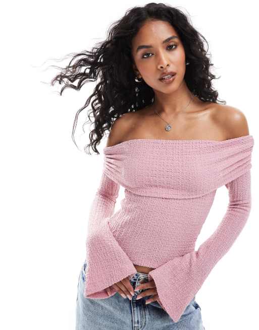 ASOS DESIGN ruched textured off the shoulder top with angel sleeves in pink