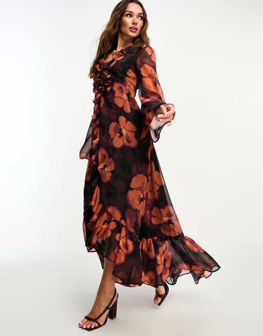 ASOS DESIGN ruffle detail plunge maxi dress with corsage in rust floral print