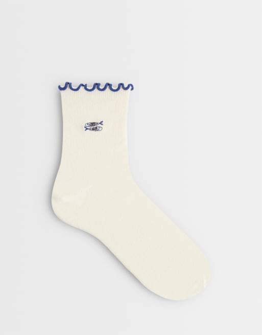 ASOS DESIGN ruffle edge ankle socks with sardine embroidery in white