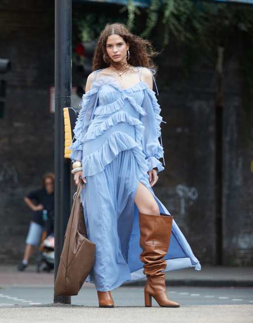 ASOS DESIGN ruffle off shoulder tiered maxi dress in mid blue