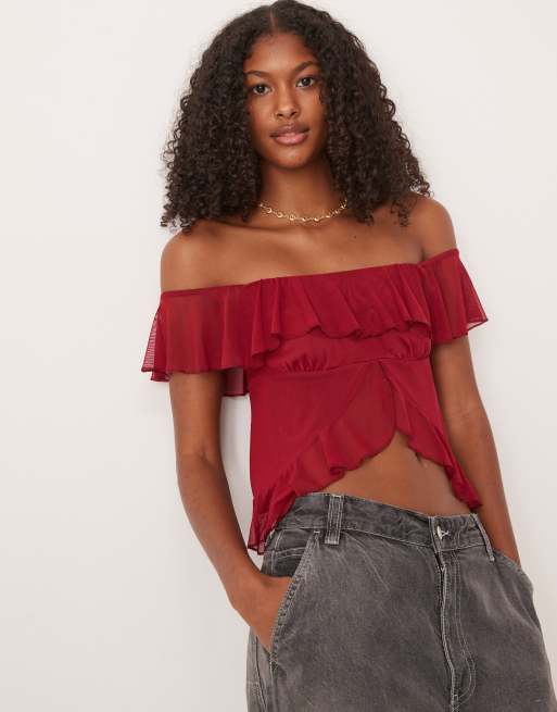 ASOS DESIGN ruffle off the shoulder split front top in burgundy