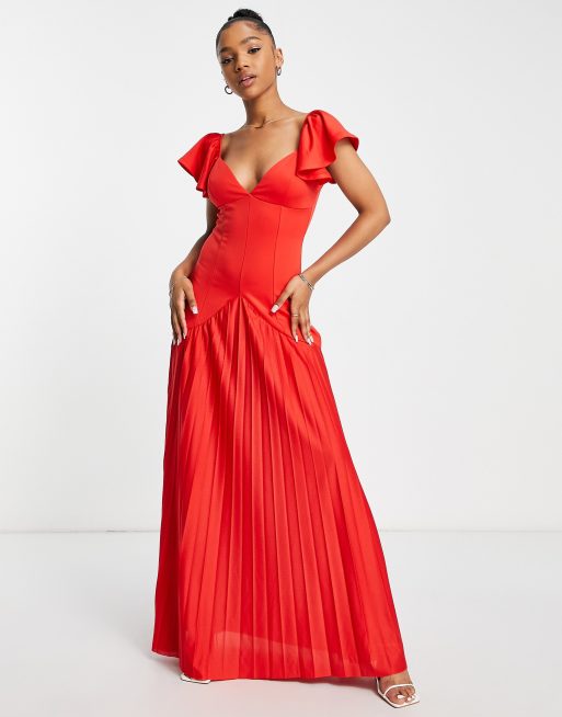 ASOS DESIGN ruffle sleeve seamed pleated maxi dress in red