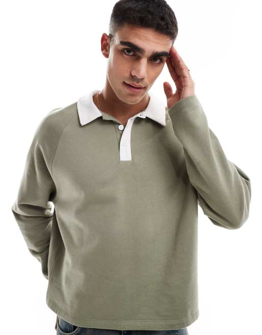 ASOS DESIGN rugby polo sweatshirt with raglan sleeves in khaki