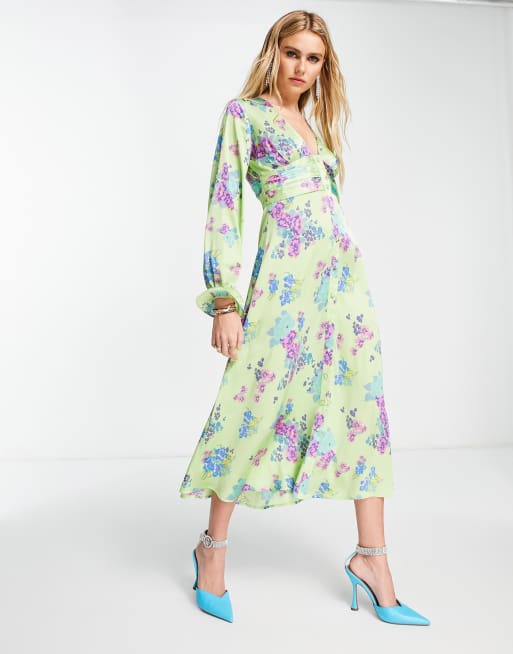 ASOS DESIGN satin button through midi tea dress with fluted sleeves in green floral print