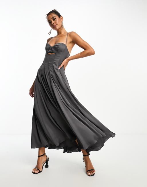 ASOS DESIGN satin cami corset midi dress with full skirt in charcoal