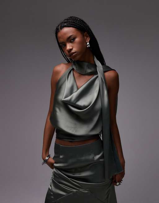 ASOS DESIGN satin drape scarf top in khaki - part of a set