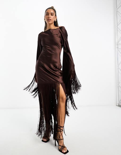 ASOS DESIGN satin flare sleeve mini dress with fringe detail in chocolate