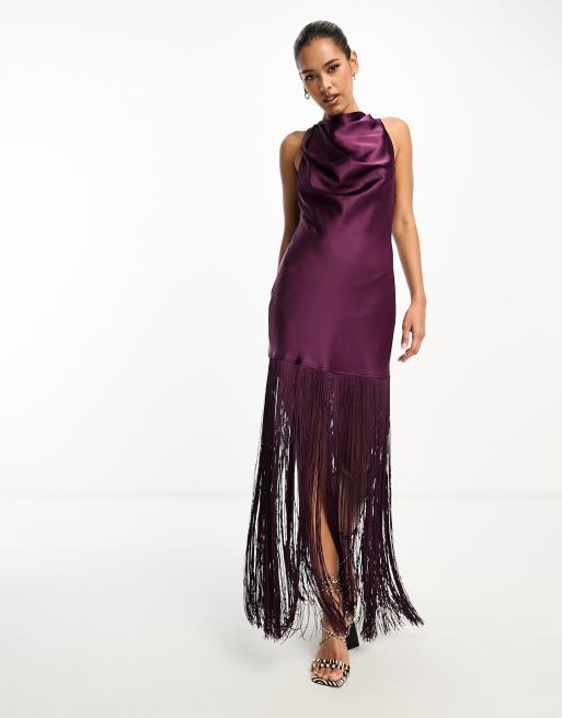 ASOS DESIGN satin halterneck mini dress with fringe hem in purple