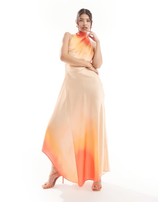 ASOS DESIGN satin high neck open back maxi dress in orange ombre print