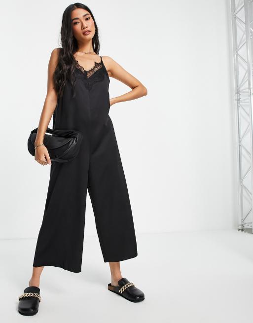 ASOS DESIGN satin lace insert cami culotte jumpsuit in black