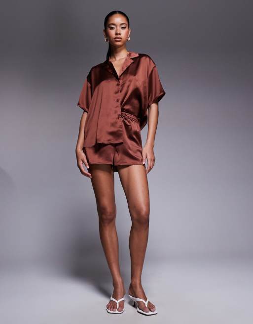 ASOS DESIGN satin shorts set in brown