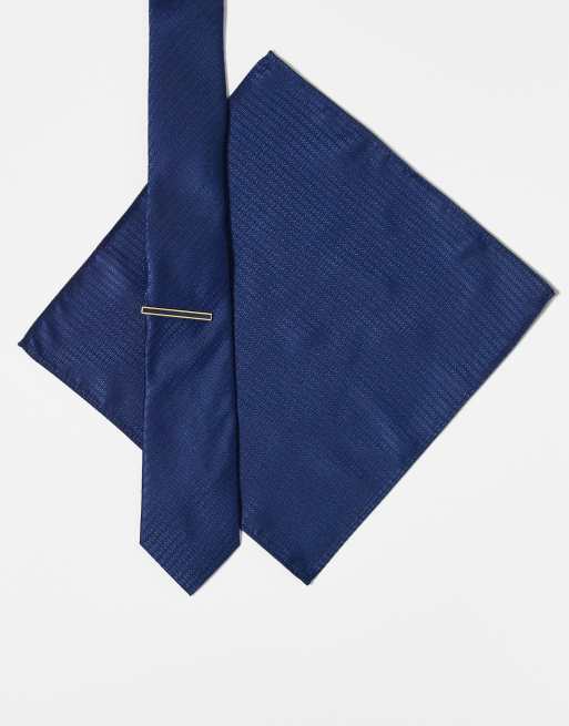 ASOS DESIGN satin textured tie and pocket square in navy with tie bar