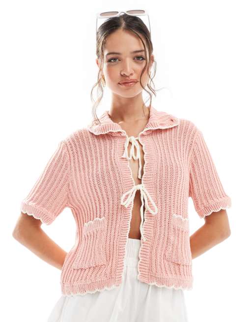 ASOS DESIGN scalloped edge collared cardigan with ties in pink