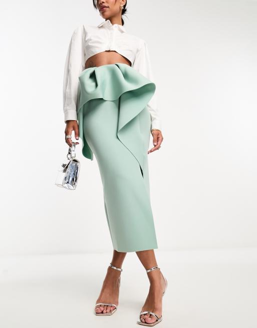 ASOS DESIGN scuba midi skirt with volume frill waist in mint green