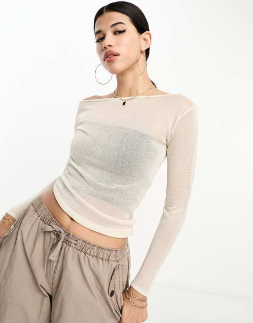 ASOS DESIGN sheer knit off shoulder top in cream