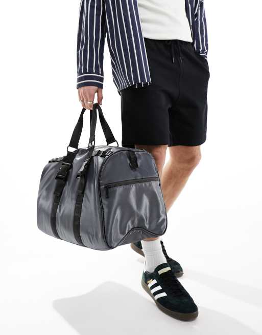 ASOS DESIGN shiny nylon duffle bag in charcoal