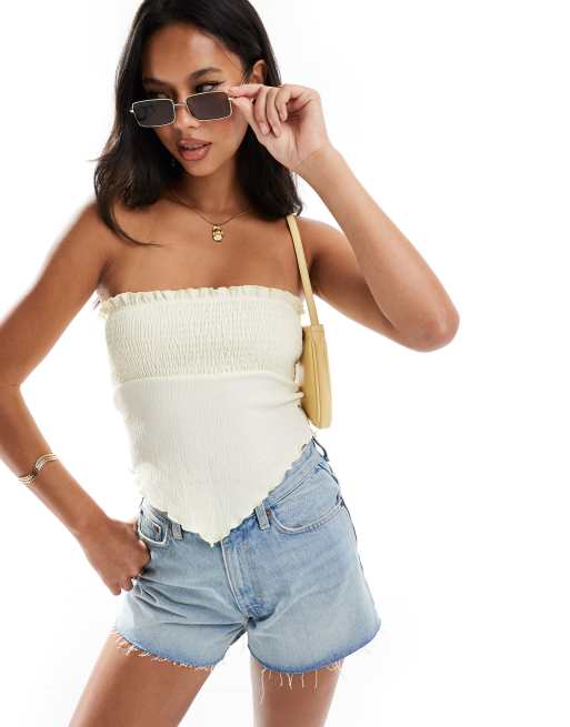 ASOS DESIGN shirred bandeau top with hanky hem in ecru