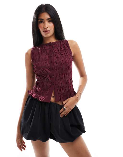 ASOS DESIGN shirred long sleeve button up top in oxblood
