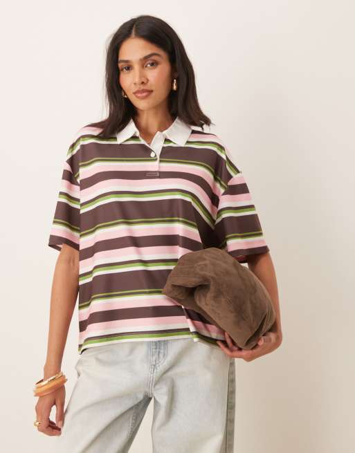 ASOS DESIGN short sleeve rugby collar tee in green and pink stripes