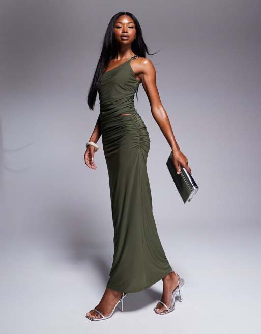 ASOS DESIGN silver chain one shoulder slinky top and maxi skirt set in khaki