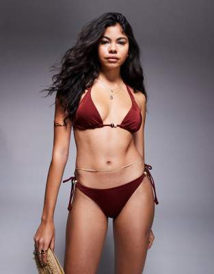 ASOS DESIGN Simone shine triangle bikini top with braided strap and beads in burgundy