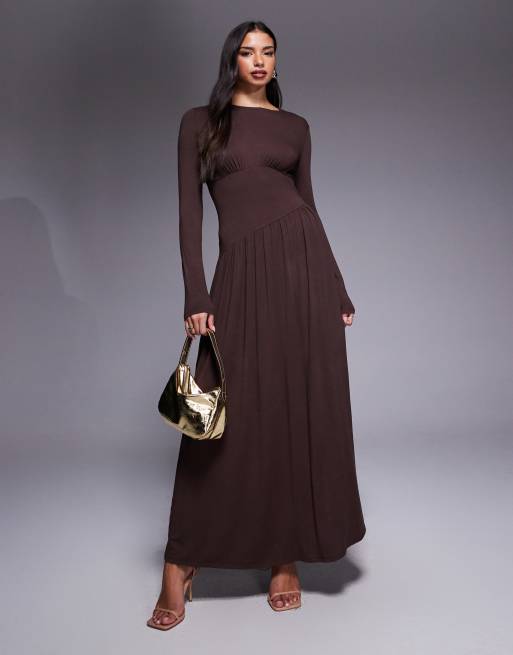 ASOS DESIGN slash neck under bust seam drape midi dress in chocolate