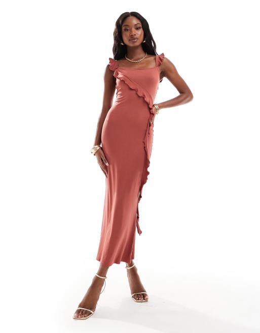 ASOS DESIGN sleeveless midi dress with asymmetric ruffle detail in rust
