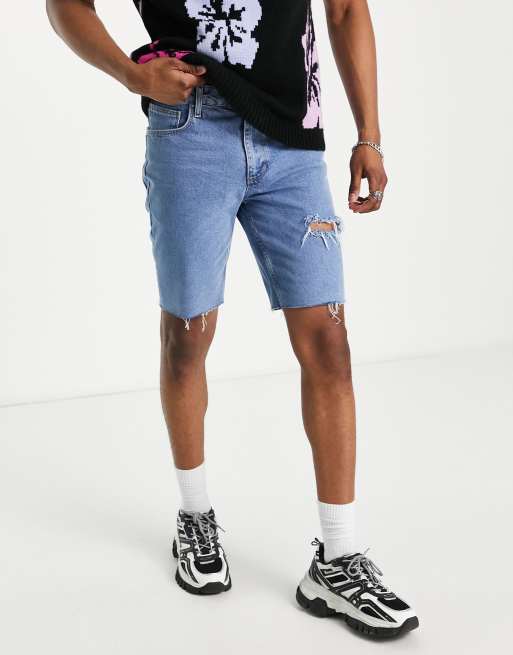 ASOS DESIGN slim denim shorts with thigh rip in mid wash
