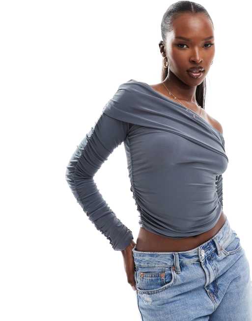 ASOS DESIGN slinky asymmetric neck ruched sleeve top in gray