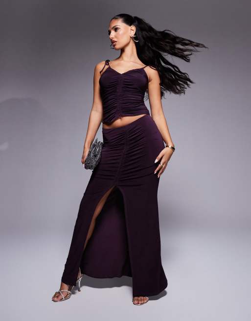 ASOS DESIGN slinky ruched cami top and maxi skirt set in blackcurrant