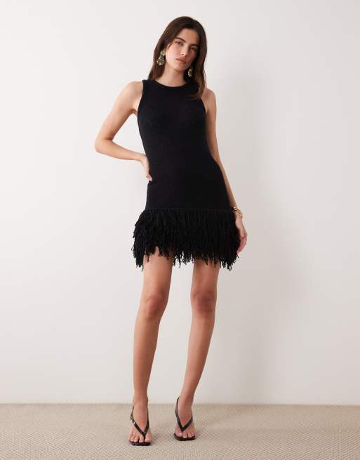 ASOS DESIGN slubby fringed mini dress in black