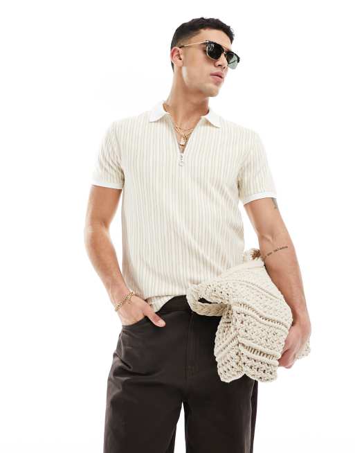 ASOS DESIGN smart polo shirt in textured beige stripe with zip