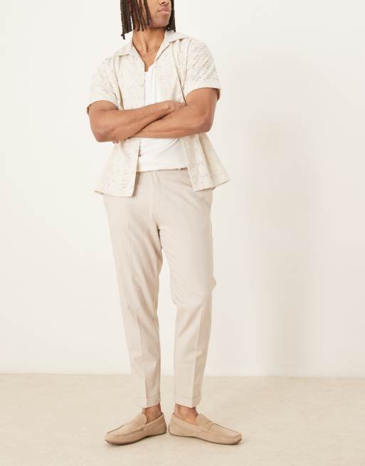 ASOS DESIGN smart tapered fit linen blend pants in stone with turnups