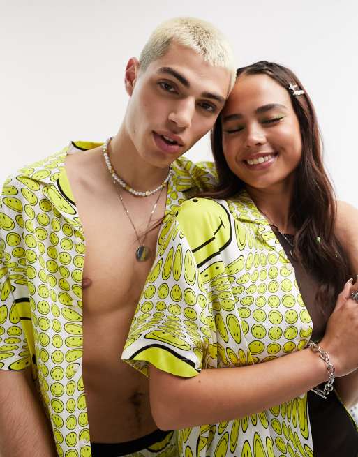 ASOS DESIGN Smiley Collab unisex relaxed camp collar shirt in yellow and white print - part of a set