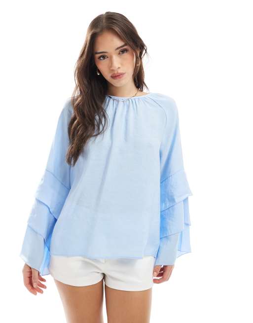 ASOS DESIGN soft touch fabric top with flare sleeves in blue