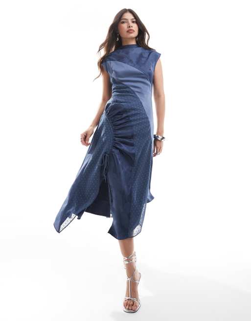 ASOS DESIGN spliced jacquard & textured midi dress with ruched side in blue
